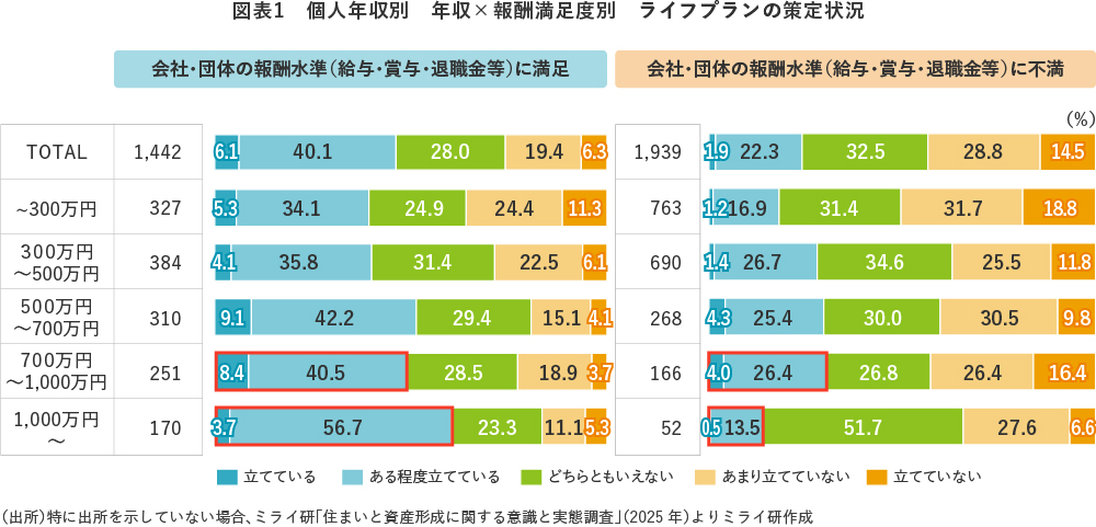 まず、ライフプランの策定状況は、どの年収区分でも「報酬に満足している群」の方が、「不満がある群」に比べてライフプランを立てている割合が多いことが分かりました【図表1】 。