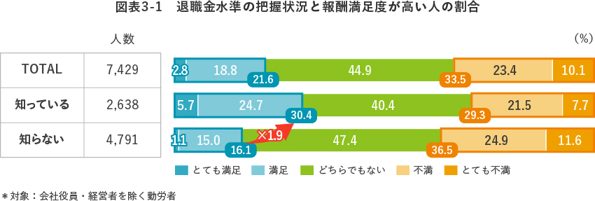 また、報酬には定例給与などに加え、原則退職時に支給される「退職金」などもあります。この退職金の水準を把握している人は、そうでない人に比べて、報酬満足度が高い人の割合が1.9倍と、大きな差となりました【図表3-1】。こちらも、年収が上がるほど、この差が顕著に広がっています【図表3-2】。