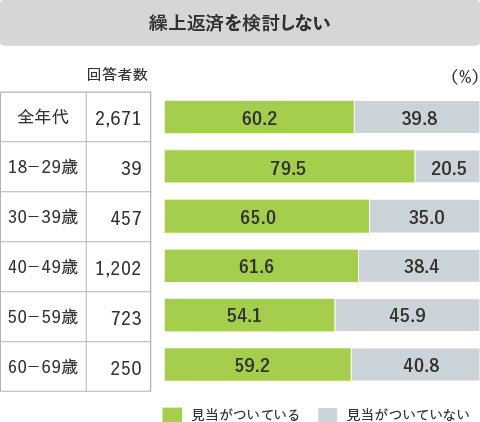 ここで、具体的な対応として「全額繰上返済」と「一部繰上返済」のいずれか、または両方を検討している人(重複を除く)を確認すると、44.2%でした(図表1)。20歳代から60歳代まで、各年代で45%前後が繰上返済を検討しており、広く選ばれている選択肢であることがわかりました。