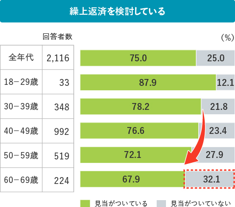 ただし、「見当がついている」と答える割合は年代が上がるほど低下し、60歳代では“繰上返済を検討する層”でも67.9%にとどまっています。言い換えると、繰上返済を検討する60歳代の約3人に1人(32.1%)は、老後資金として必要な金額の見通しが立っていないことになります。